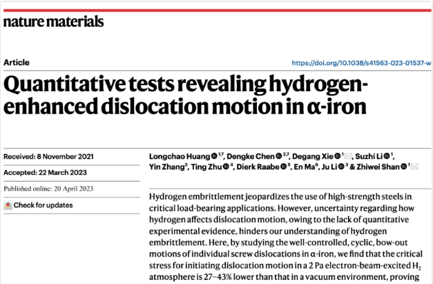 船建学院教师在《Nature Materials》发文揭示氢与体心立方金属铁中螺位错的相互作用
